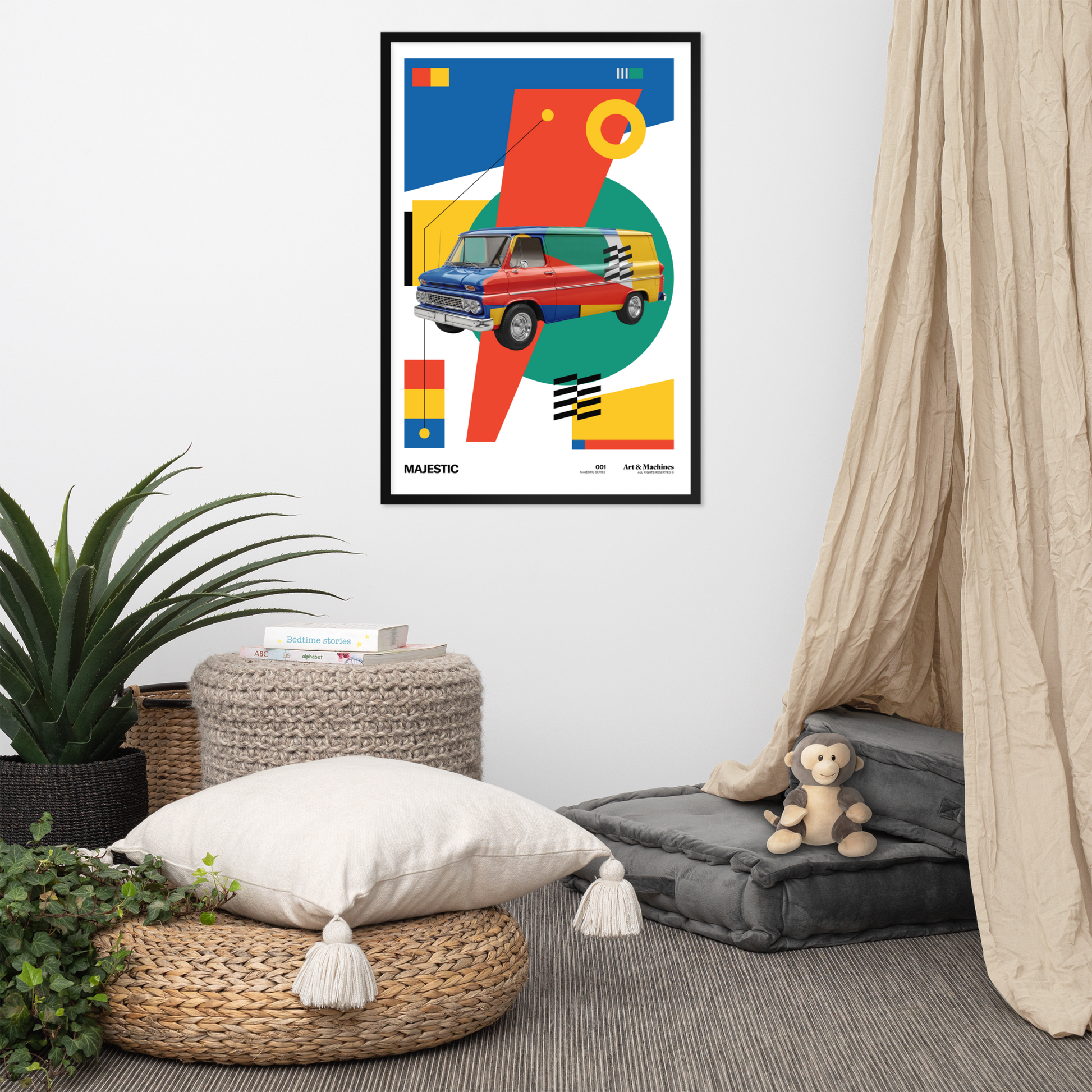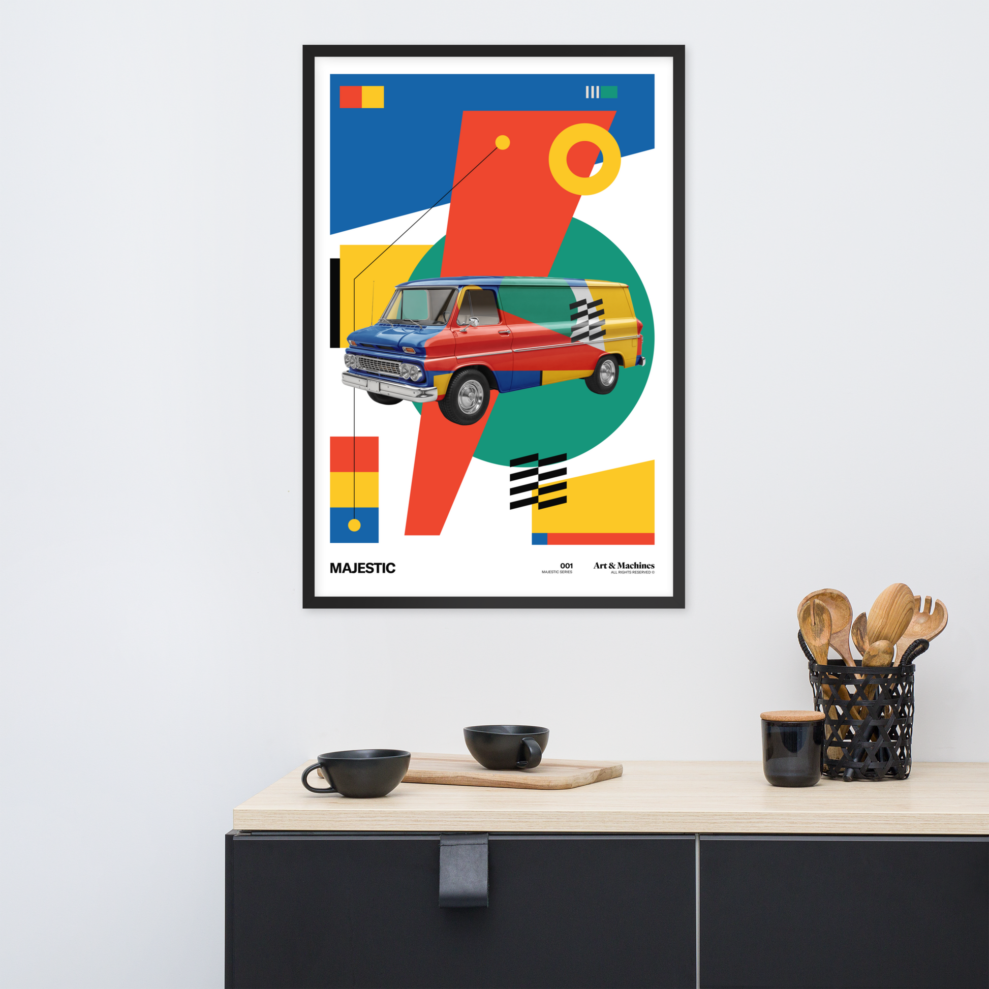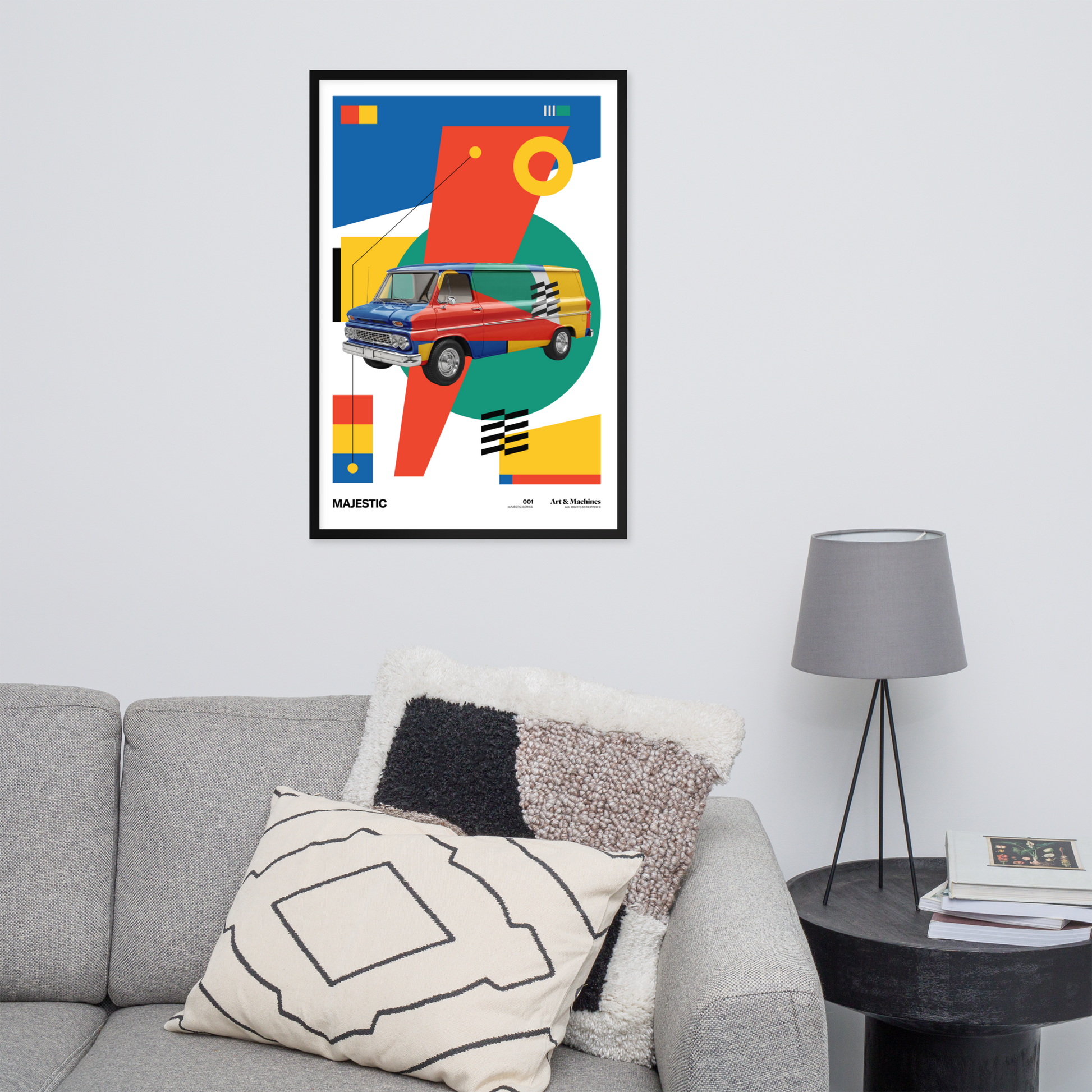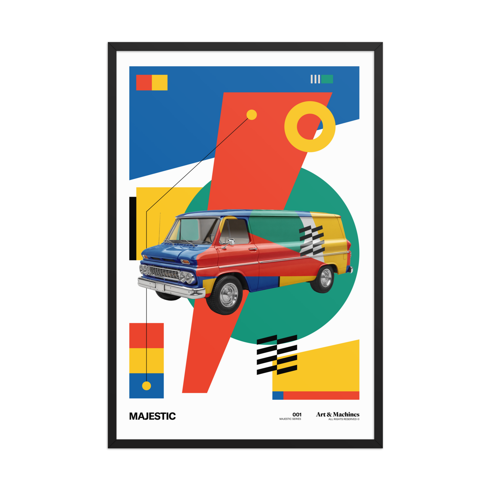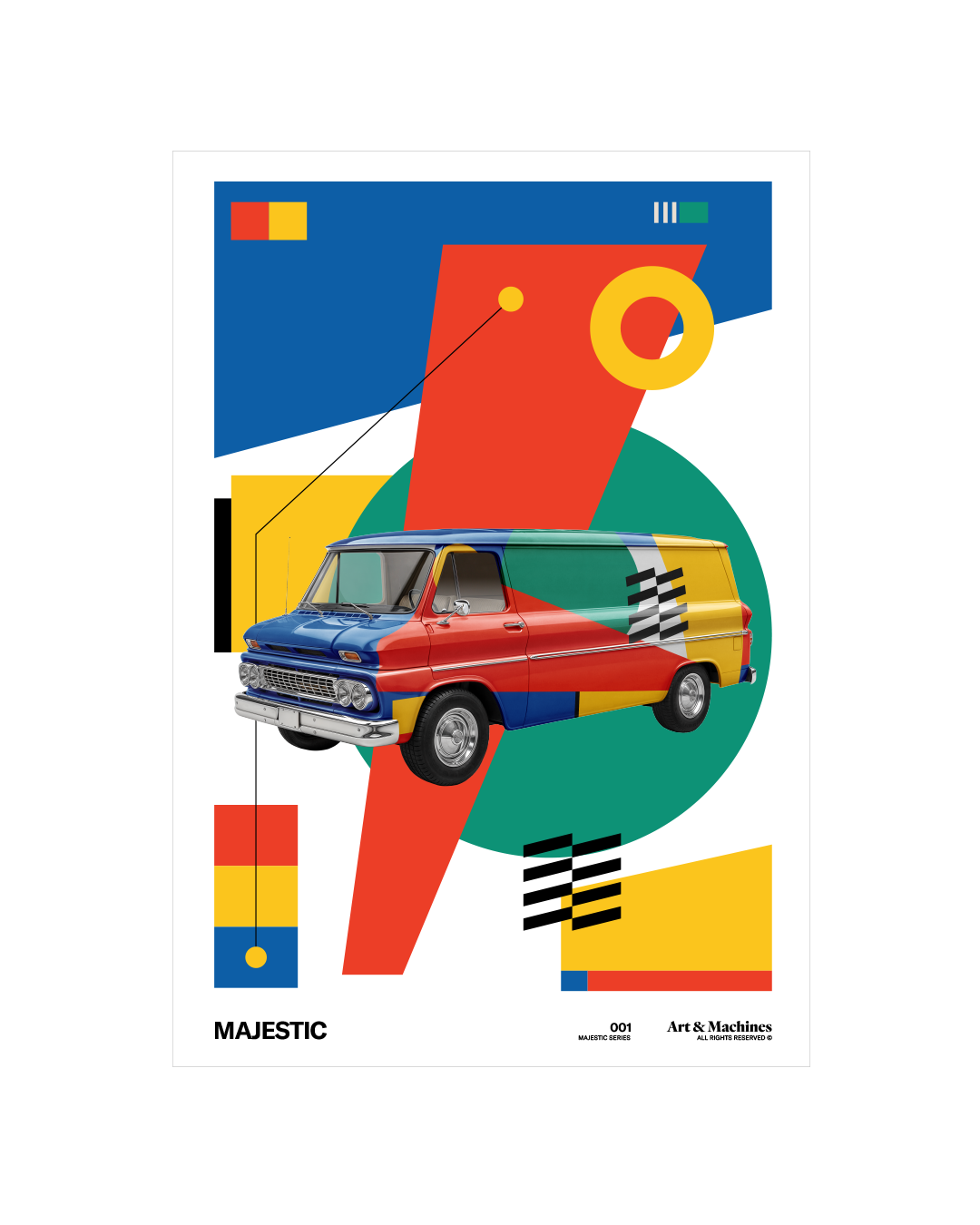 Un diálogo entre pasado y presente: una furgoneta clásica de los años 50 se convierte en soporte de un lenguaje geométrico y vibrante, heredero del Bauhaus reinterpretado en los 90. El contraste entre la carrocería retro y la energía cromática transforma el vehículo en un ícono atemporal, uniendo nostalgia y modernidad en un mismo póster.