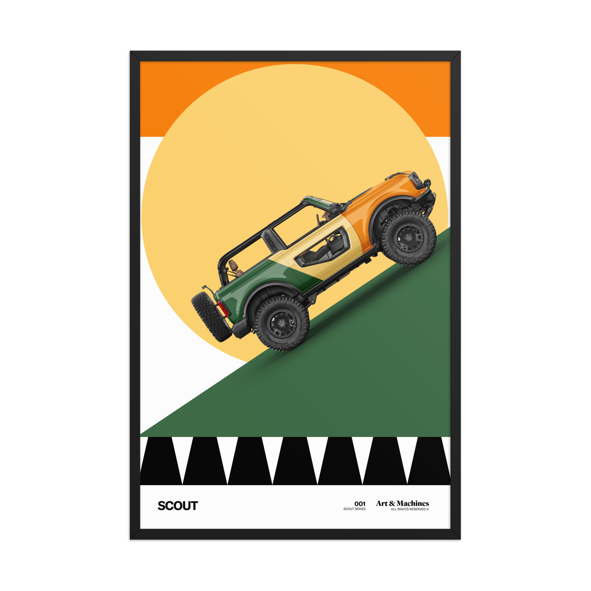 El automóvil, elevado sobre la pendiente, encarna la idea de búsqueda y desafío, mientras el gran círculo solar enmarca la escena como un horizonte optimista. La paleta cálida y terrosa refuerza el espíritu aventurero, equilibrando fuerza, simplicidad y dirección.